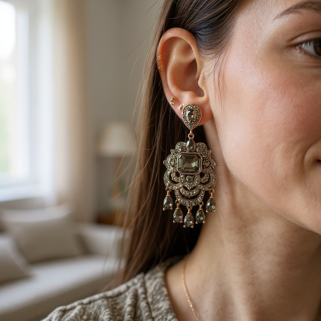 Bronz gövde ve özenle seçilmiş ince cam kristal taşlar, nikel içermez. Hassas ciltler için uygundur. Her ürün özel olarak üretilir.